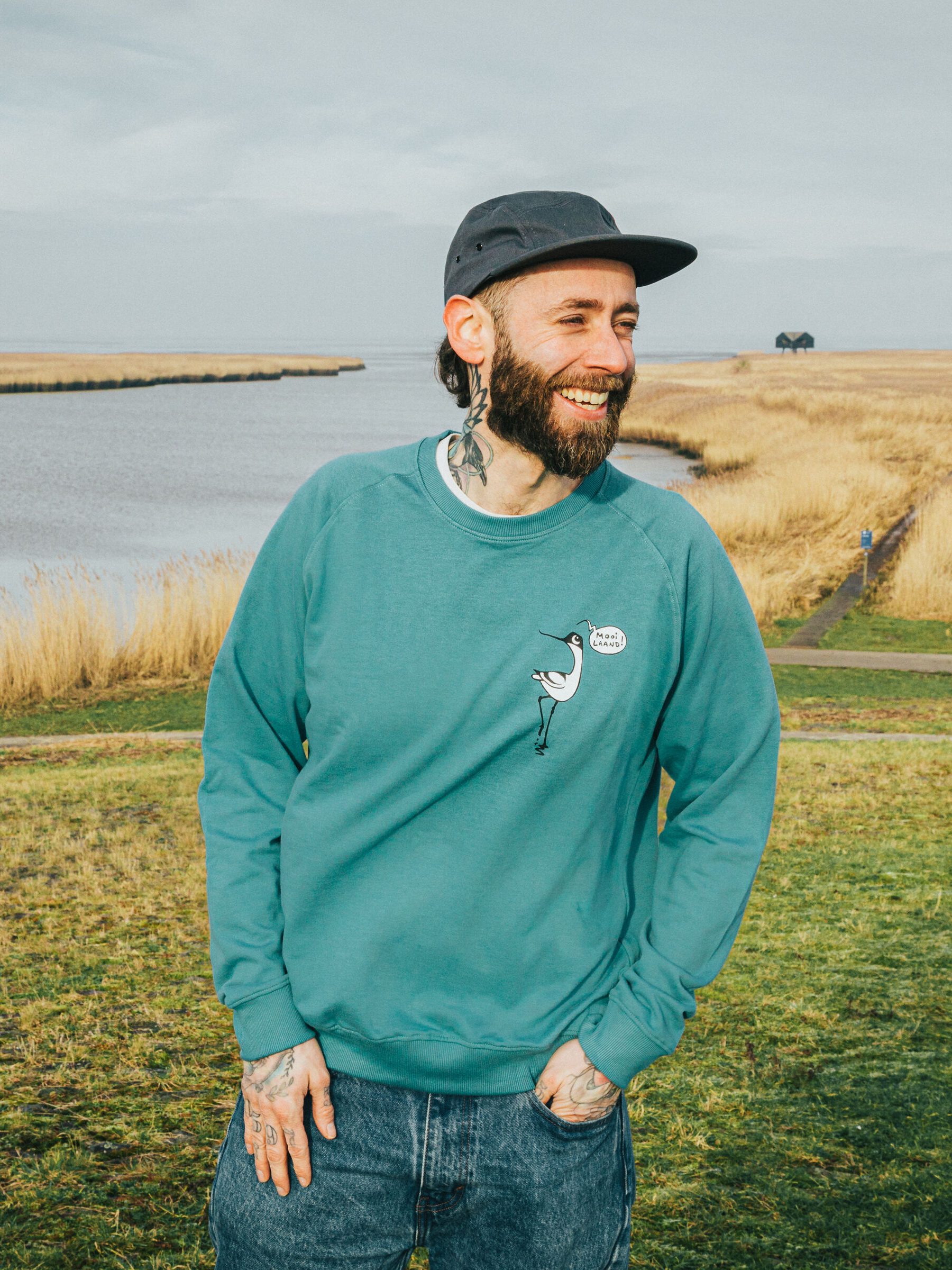 Mooi Laand is meer dan een sweater. Het is een ode aan het Groninger landschap. Ontwerper en vogelaar Willem Kolvoort liet zich inspireren door het Waddengebied en vertaalde dat in een uniek ontwerp. TikTok Tammo draagt de sweater met trots en steunt zo het werk van Het Groninger Landschap.