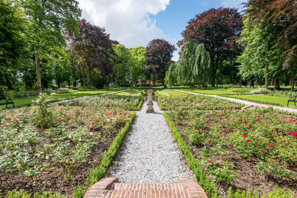 De tuin heeft een symmetrische indeling, plantvakken zijn omzoomd door strakke buxushagen. Vanuit de borg is een lange zichtlijn over twee achter elkaar gelegen langgerekte vijvers. De tuin is rijk gedecoreerd met vazen en beelden op de kruispunten in de tuin. Net als de borg en de tuin zijn deze ‘rode’ onderdelen van de tuin rijksmonumenten: de siervazen, de zonnewijzer, de brug, de tuinmuur en de trappen. De tuin is van zonsopkomst tot zonsondergang geopend voor bezoekers.